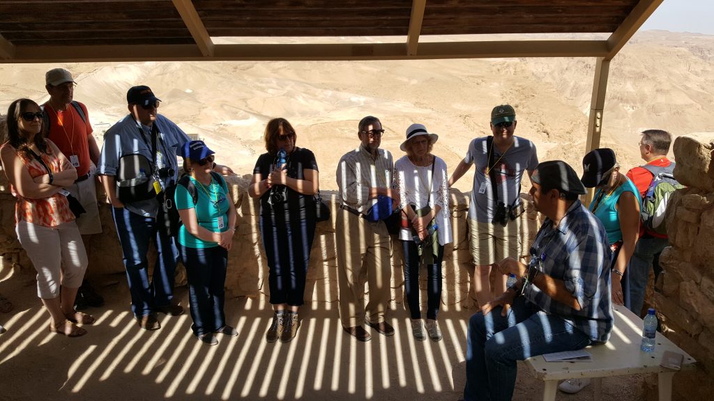 We checked out of our beautiful hotel on the Dead Sea this morning. The only good thing about that is that we’re headed to Jerusalem later today. This morning we began at Masada. What an unbelievable feat of building and engineering Masada was. Imagine a huge fortress built on the top of a flat mountain. This mountain isn’t the type of we’re used to in most parts of the US. This is a rock mountain. The fortress was built by Herod the Great between 30—20 BC. It’s in a very strategic location halfway between Jerusalem, where Herod spent much of his time, and Edom, his home country. For Herod, Masada was the perfect location to flee if there was ever any danger, like an uprising or an attack. He was a passionate, paranoid and brutal leader. But he was a master builder and sought to leave grand structures as his legacy. Masada was about a half mile long and had pools, gardens, opulent living quarters, and bath houses. Bath houses were so expensive to build, many cities didn’t have one—Masada had four.