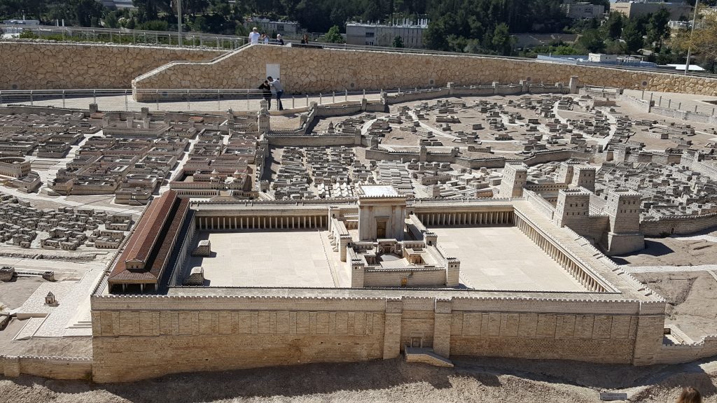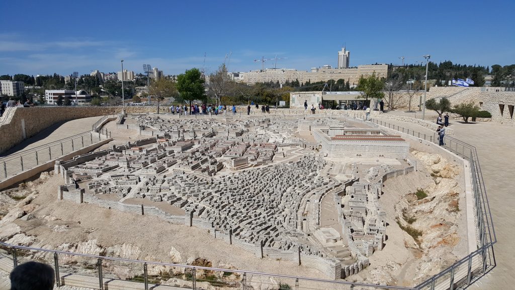 I know I’ve mentioned the challenge I’ve had trying to grasp the lay of the land here in Jerusalem. At the Shrine of the Book there was the most welcoming sight—a huge replica of Jerusalem! This model was built as a memorial by a man whose son died in the War of Independence. It was also given as a model to teach the lay of the land to people like us. Because Jerusalem changed over the years the model was based upon Jerusalem around 66 AD, when it was at its peak architecturally. Also here at the museum is a display of the Dead Sea scrolls and other artifacts found in the Qumran caves. The museum has an amazing design to resemble the jars the scrolls were discovered in.
